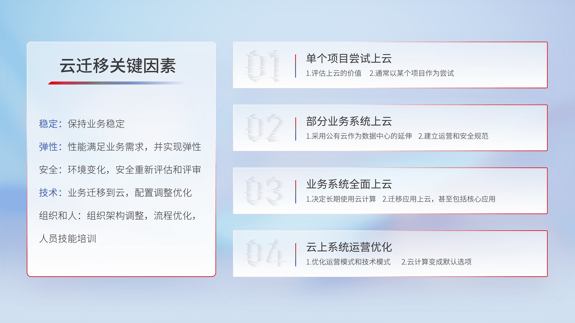 结合实际业务,,,,从规划设计、、、、云平台选型、、、、云原生改造、、、数据迁移、、集成交付,,迁移全过程为客户识别最佳上云路径,,,,做好风险识别管理,,,设计网络架构、、、身份权限、、、、安全审计合规、、操作审计、、、、日志审计、、、监控告警策略、、、、多站点容灾设计等,,,对云上基础设施进行整体规划,,提升IT治理水平,,,以满足弹性、、、高可用、、、高性能的需求。。